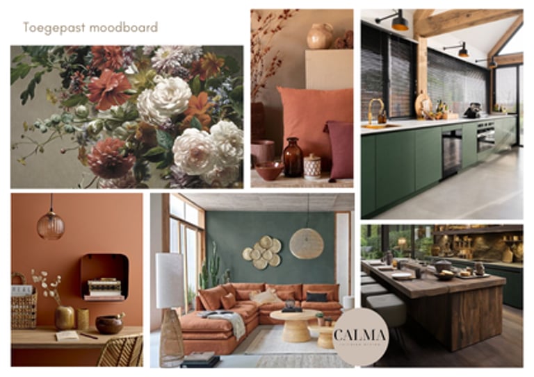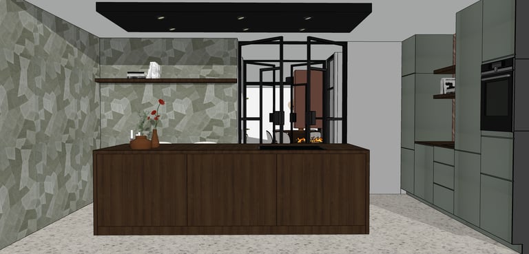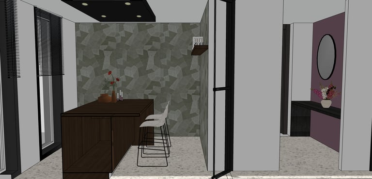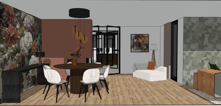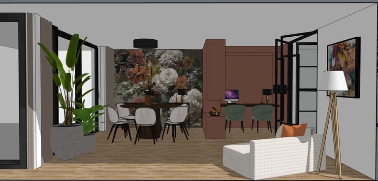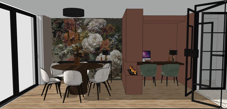 Ze wilden veel vrolijke kleuren in hun huis, dus dit hebben we toegepast. Om de ruimte te breken, hebben we een open haard geplaatst tussen het bureau en de eetkamer.