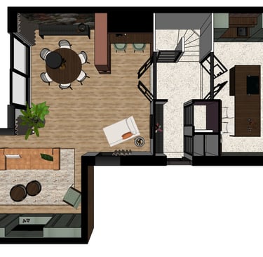 To break up the space, I placed a fireplace in the space between the desk and the dining area.