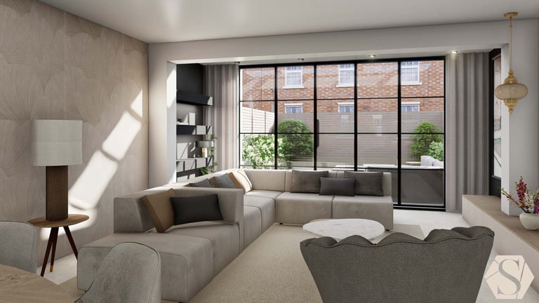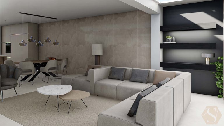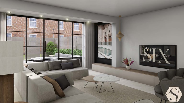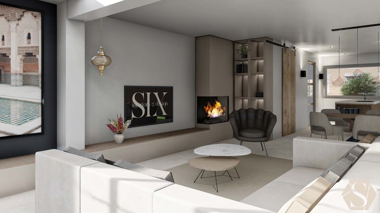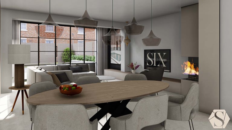 De keuken is naar voren verplaatste en er is een aanbouw toegevoegd bij dit ontwerp met een raam en deur partij over de volledige lengte. Er is een haard gecreëerd met een tv meubel over de volledige lengte van de muur.