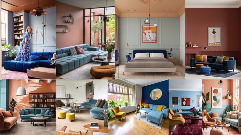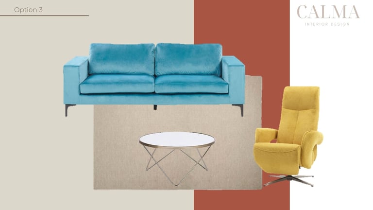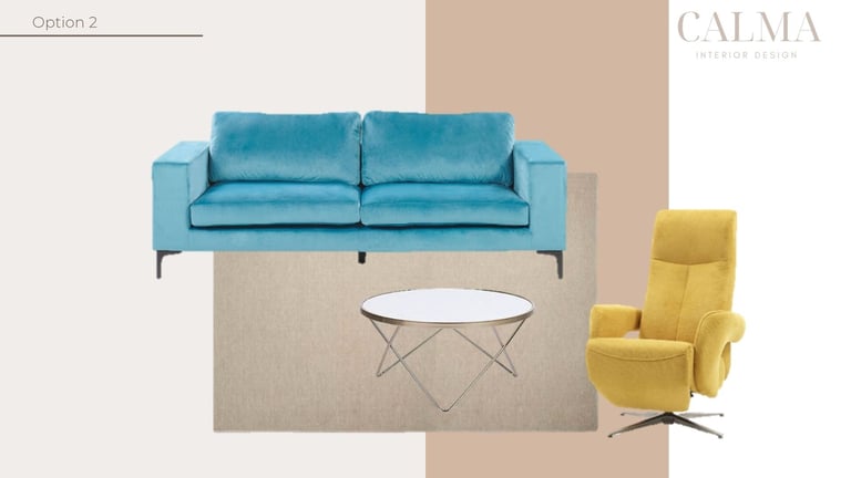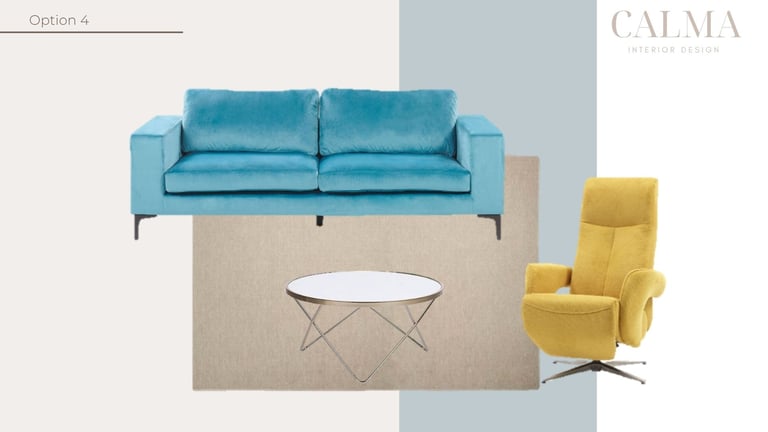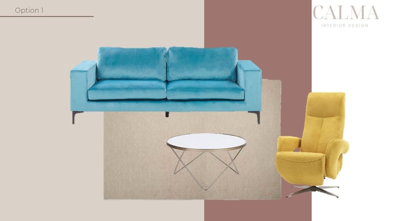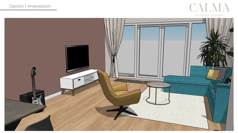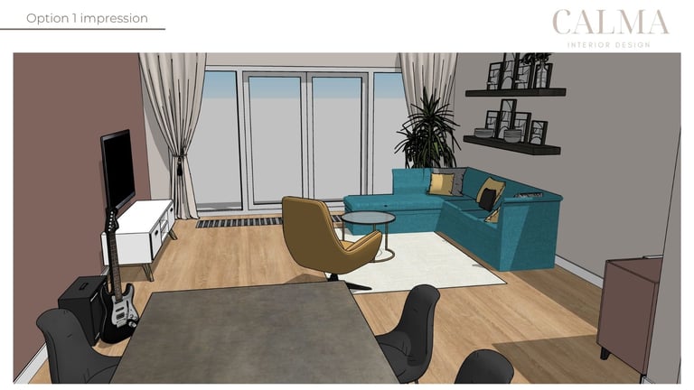 Voor dit kleurrijke en persoonlijke interieurontwerp hebben we gekozen voor een gedurfde mix van meubels en kunst. De bestaande blauwe bank blijft een belangrijk en opvallend element in de ruimte, net als de nieuwe gele stoel die toegevoegd wordt voor extra levendigheid. De bestaande meubels blijven grotendeels behouden, enkel de stoelen worden vernieuwd. Het bureau en de bureaustoel verhuizen naar boven, en de boekenkast blijft staan.