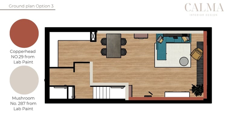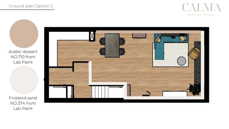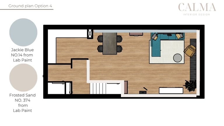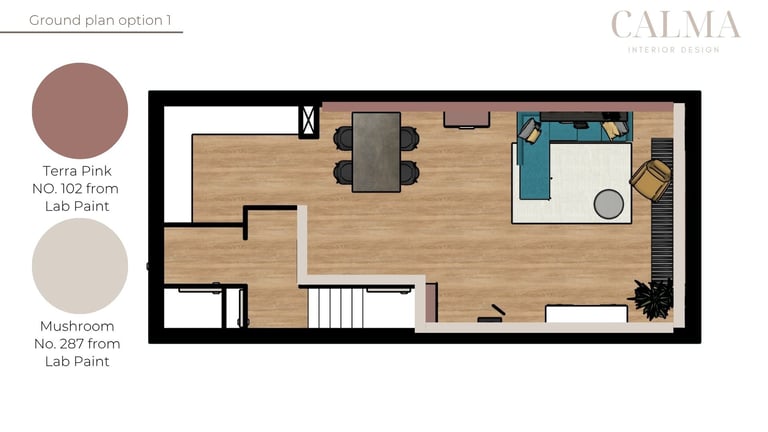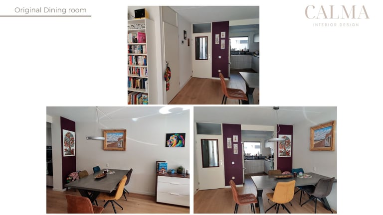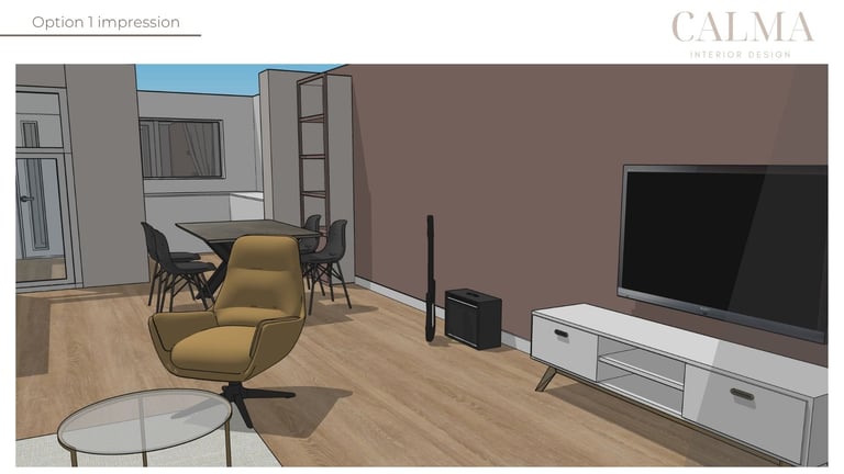 De ruimte kent een open indeling waarin keuken, eetkamer en woonkamer naadloos in elkaar overlopen. Dankzij het grote raam aan de achterzijde baadt de ruimte in daglicht – perfect om te spelen met zowel rijke als zachte kleuren. De kleurstelling is daarom niet alleen esthetisch, maar ook praktisch afgestemd op het dagelijks gebruik, zoals het intensief gebruikte eetgedeelte en de laminaatvloer.