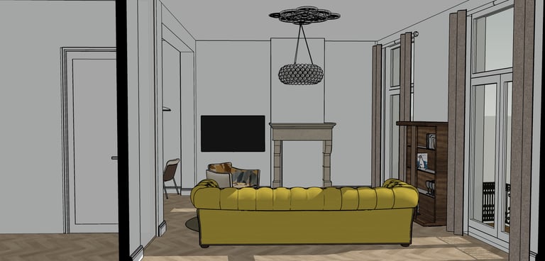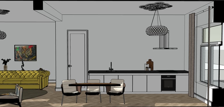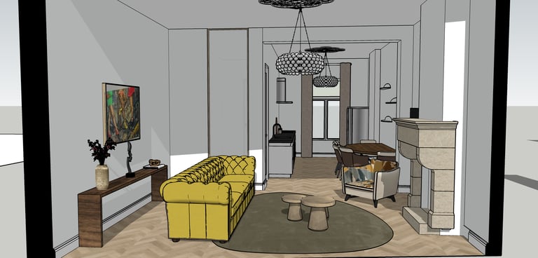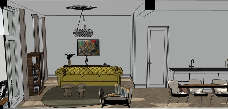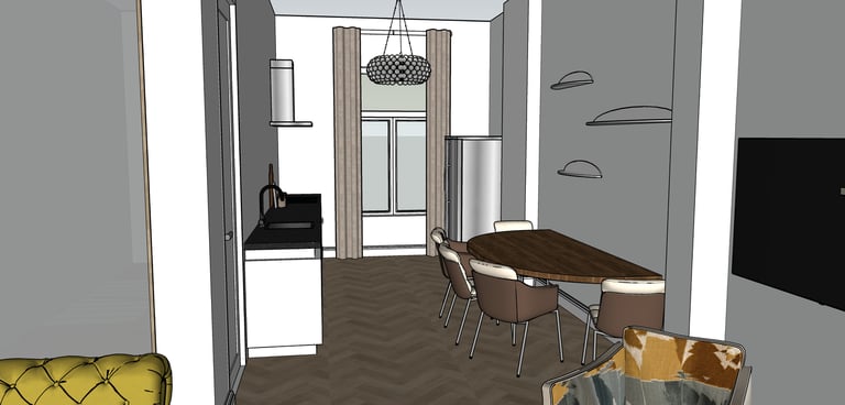 In samenwerking met Cube28 heb ik dit project aan de Stenenwal mogen ontwerpen, er was al een architect en aannemer aan te pas gekomen om het huis te moderniseren. Samen met Cube28 is de inrichting van de woonkamer, keuken en slaapkamers ingericht. Het hoofdonderdeel en eyecatcher van dit project was de gele Chesterfield bank waar wij de andere meubels op hebben aangepast.